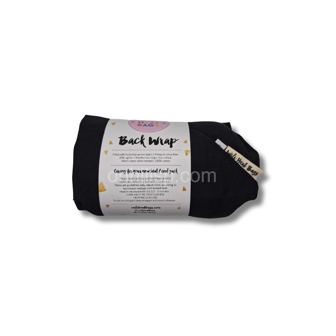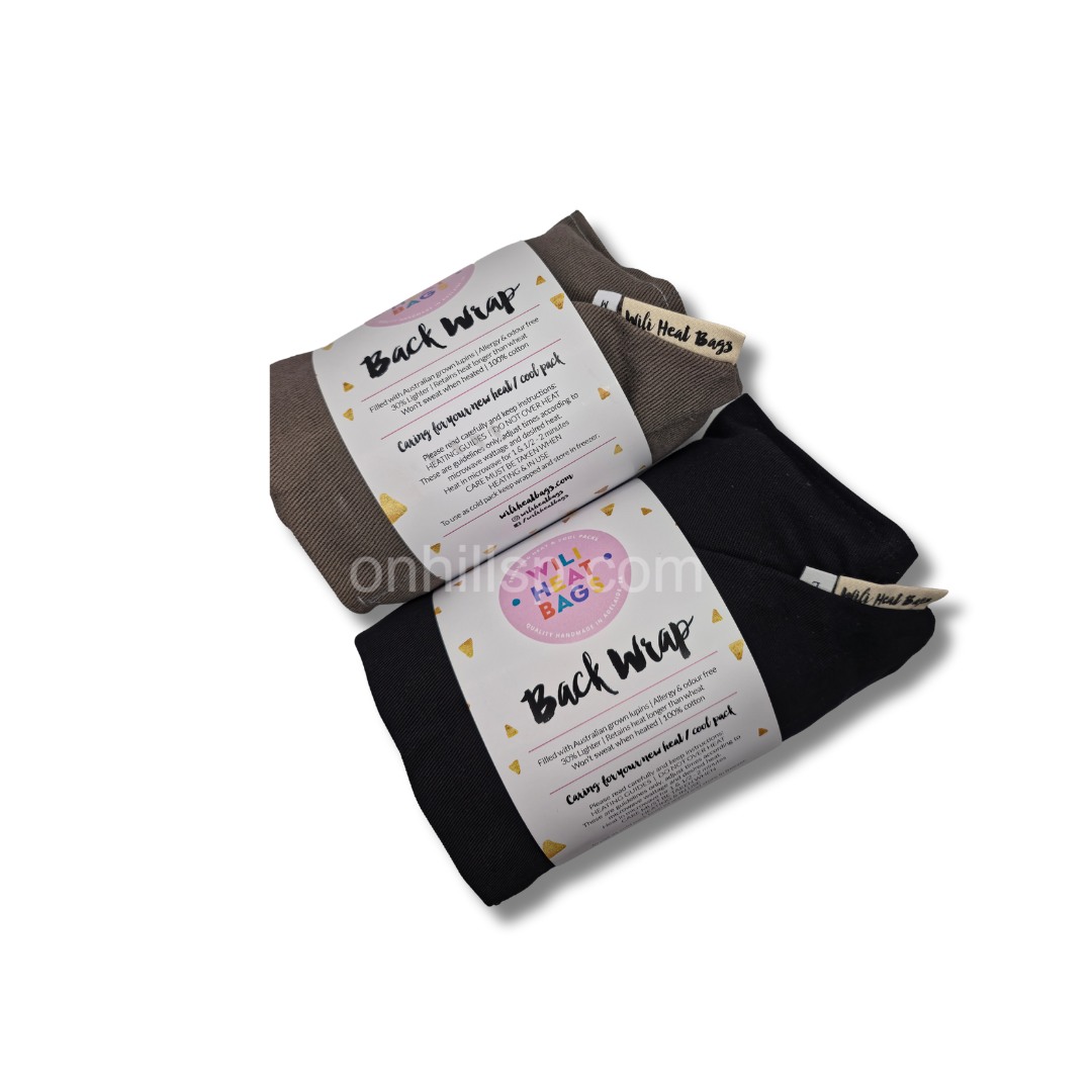 This heat pack is filled with ODOUR FREE Lupins. These are a great heat conductor and don’t burn or give off smells when being heated in the microwave. No more smelly heat bags. The Back Wrap Heat pack has 8 individual panels sewn into them so that the heat is evenly distributed across your lower back. The adjustable velcro strap holds your back wrap in place. This way you can continue doing your daily activities while experiencing pain relief from the heat pack. You can also use it across your stomach to help relieve stomach cramps, or sideways across aching hips or other body areas. The pack can also be used as a cooling pack. Just place your Back wrap in a ziplock bag in the freezer. The BackWrap is available in a Medium or Large size. Medium:12-14 Large: 16-18. Available in a black or grey color.